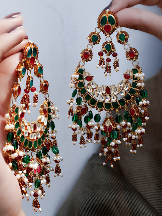 Nitasta Red-Green Kundan Chaandbaali Earrings