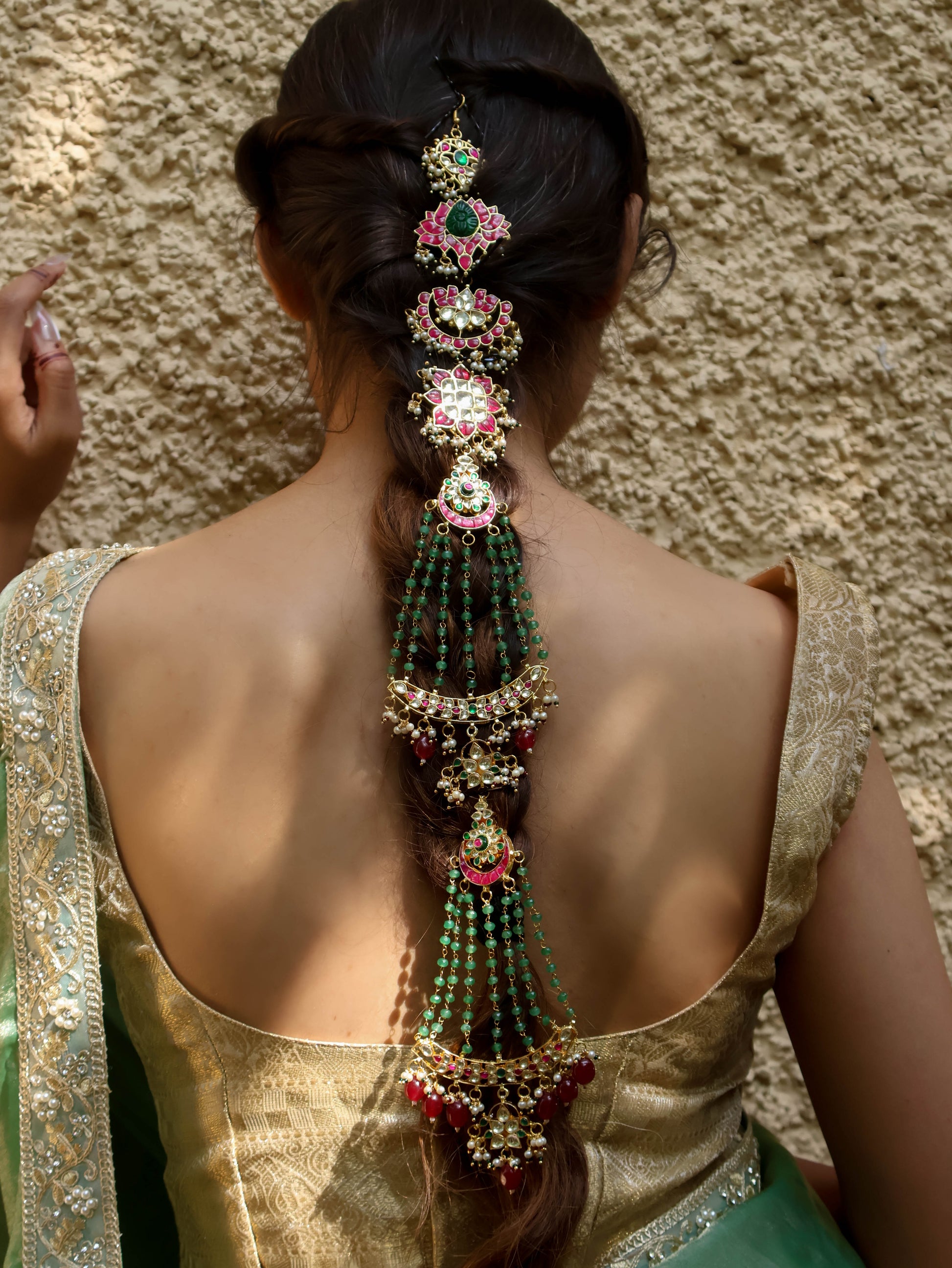 This exquisite hair accessory showcases a delicate blend of soft pink and lush green hues, bringing a fresh and feminine charm to any hairstyle. Crafted with intricate kundan work, the piece features enchanting floral and lotus motifs—symbols of beauty, grace, and renewal.